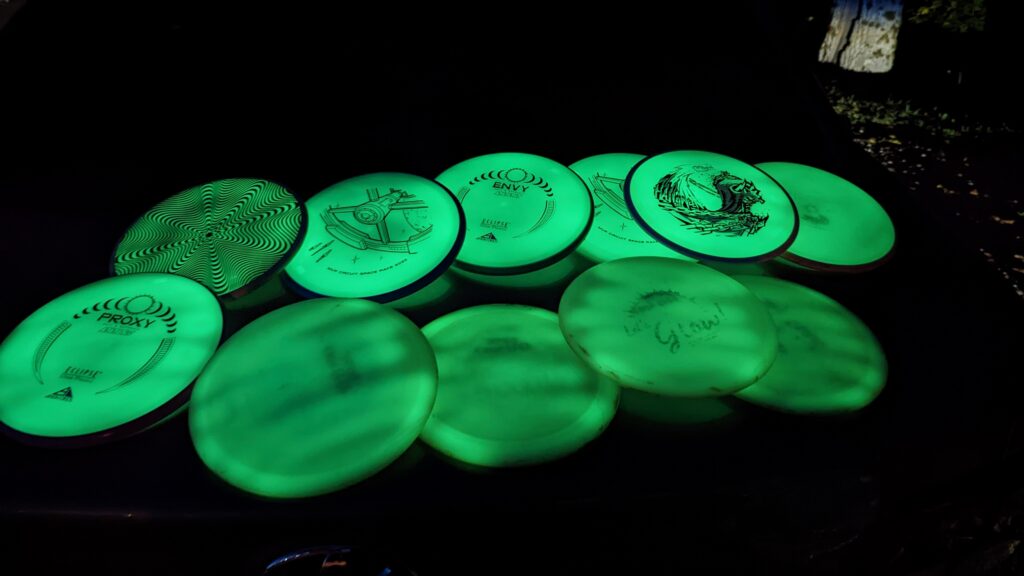 Ever since I found out about Eclipse 2.0 glow plastic, I’ve been only using their glow discs during my glow rounds. My favorite glow putter is the Proxy, favorite midrange is the Hex, Insanity and Resistor in the fairway slot and Wave in the distance driver seat. And to be fair, you really don’t even need that many glow discs to play glow rounds, you only need ONE!