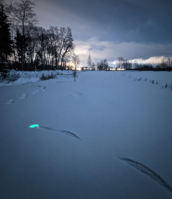 I usually play around 100 glow rounds a year. Yes, you read that correctly, 100 glow rounds a year! I told you, daylight here in Estonia is scarce during wintertime and colder temperatures alongside a thick snow blanket don’t stop me from playing. On the contrary, I often play only glow rounds in winter because of the deep snow, since finding glow discs in the dark buried beneath the snow is actually way easier than during the daytime. Because the glow plastic is so bright, they can shine through a FOOT of snow!