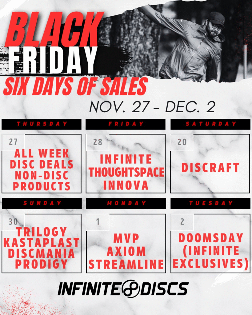 Infinite Discs big sale will begin on Thanksgiving Day, November 27th and run through December 2nd.