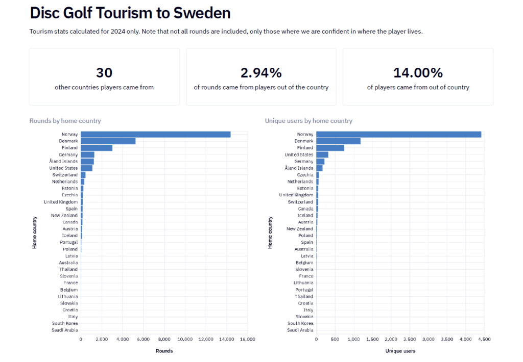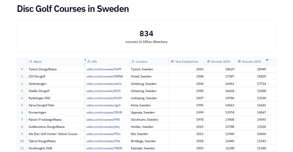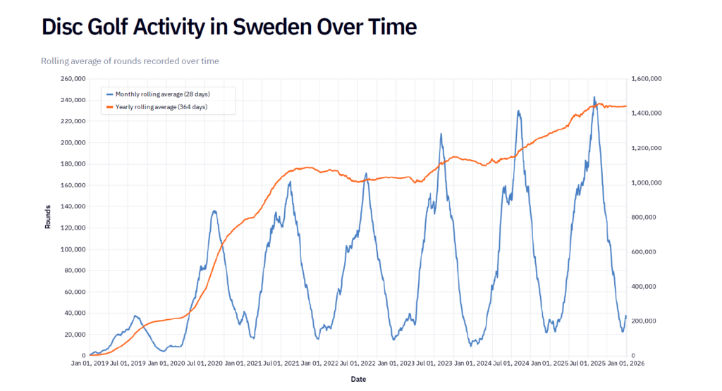 According to the latest UDisc stats, the number of rounds played by Swedish players has increased sevenfold since 2019 and the growth hasn’t slowed even after the end of the pandemic. Sweden now has around 830 courses and roughly 74,000 unique players used UDisc in 2025, recording an impressive 1,441,650 rounds.