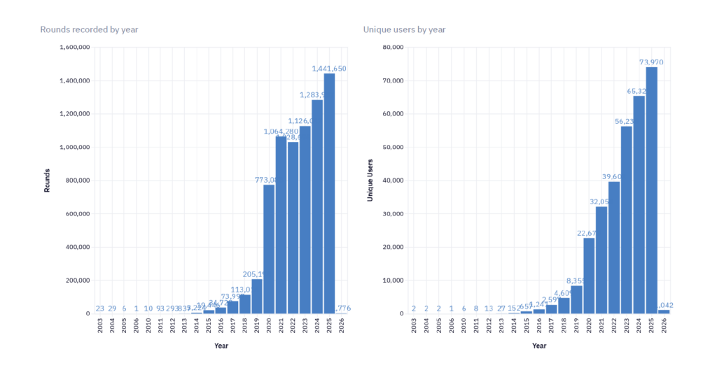 The number of unique players keeping score on UDisc has also jumped from 8,355 in 2019 to 73,970 in 2025, a staggering 8.8X increase in unique players using the UDisc app.