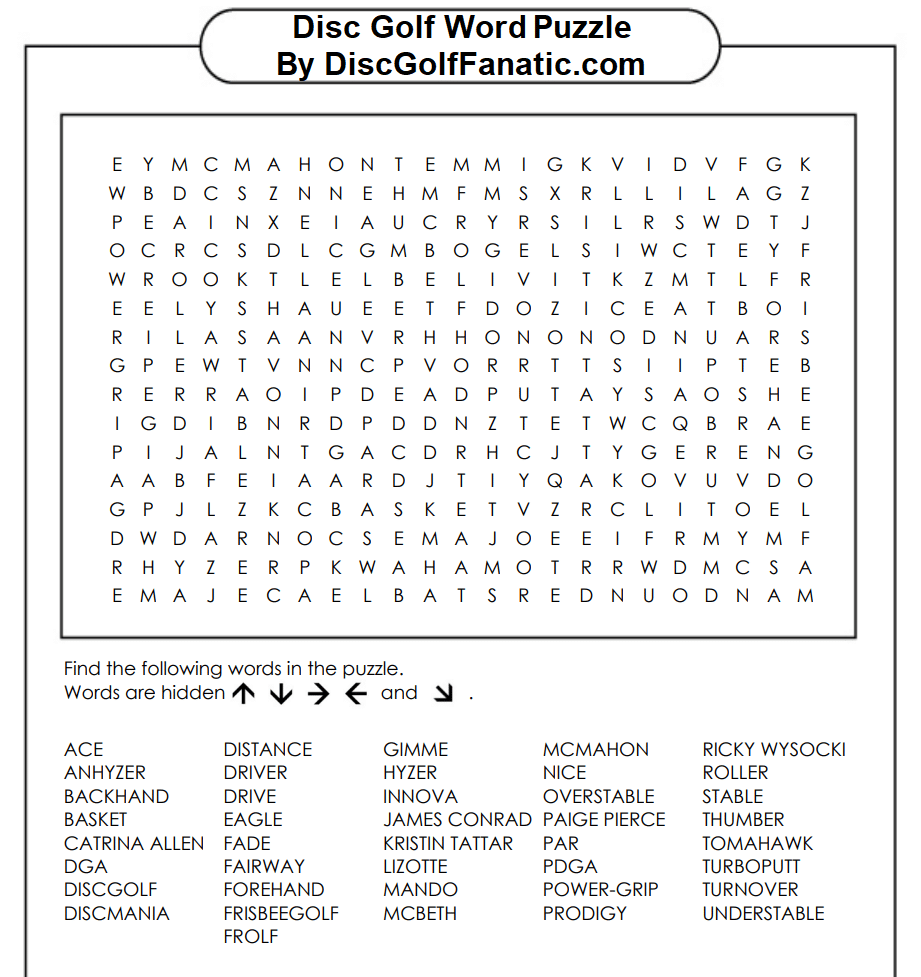 Here’s a huge Disc Golf related Word Puzzle for you to print out and complete! Just click on the image/puzzle and you will be redirected to a separate page, where you can either download the image or print it out. PS! For solutions scroll down!